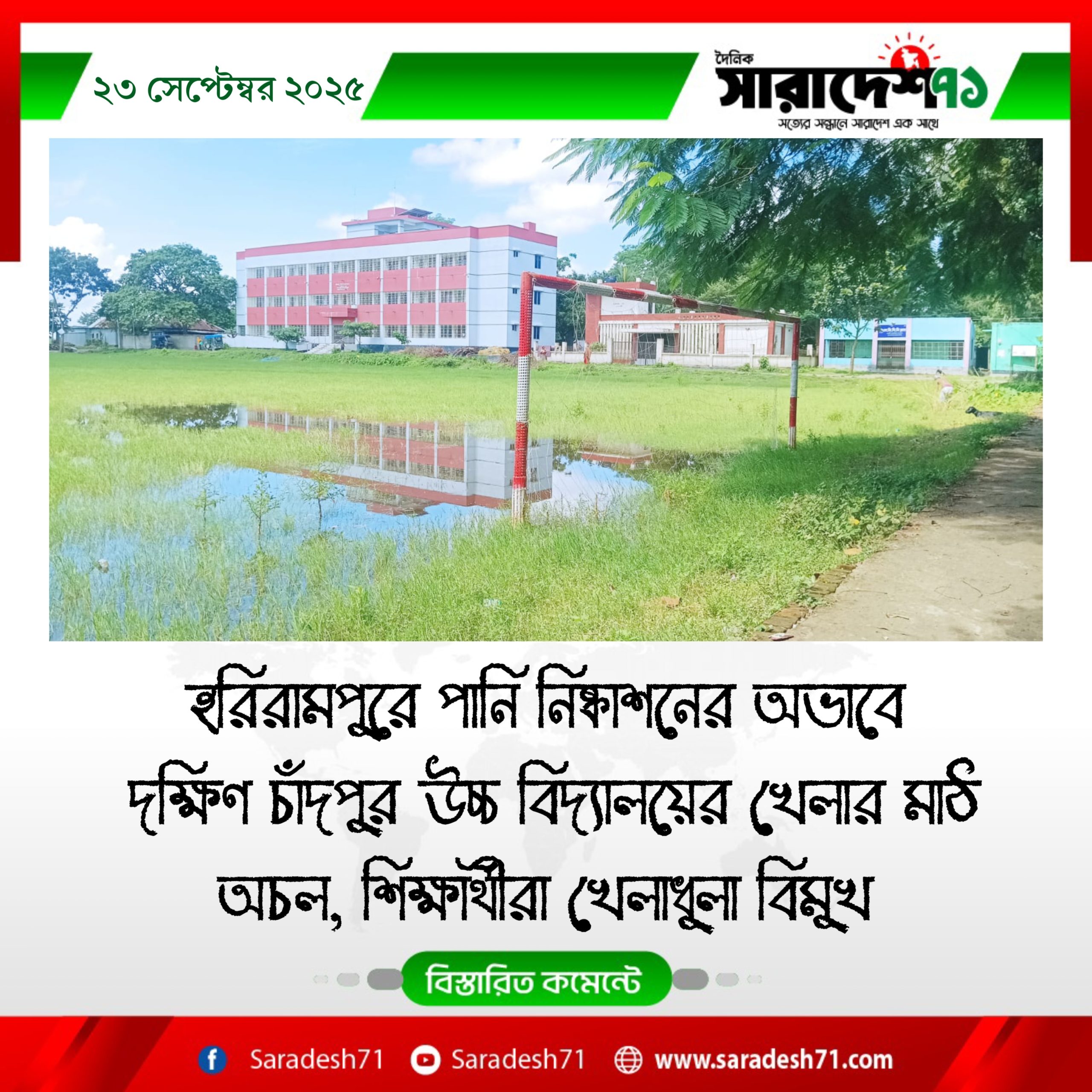 হরিরামপুরে পানি নিষ্কাশনের অভাবে দক্ষিণ চাঁদপুর উচ্চ বিদ্যালয়ের খেলার মাঠ অচল, শিক্ষার্থীরা খেলাধুলা বিমুখ