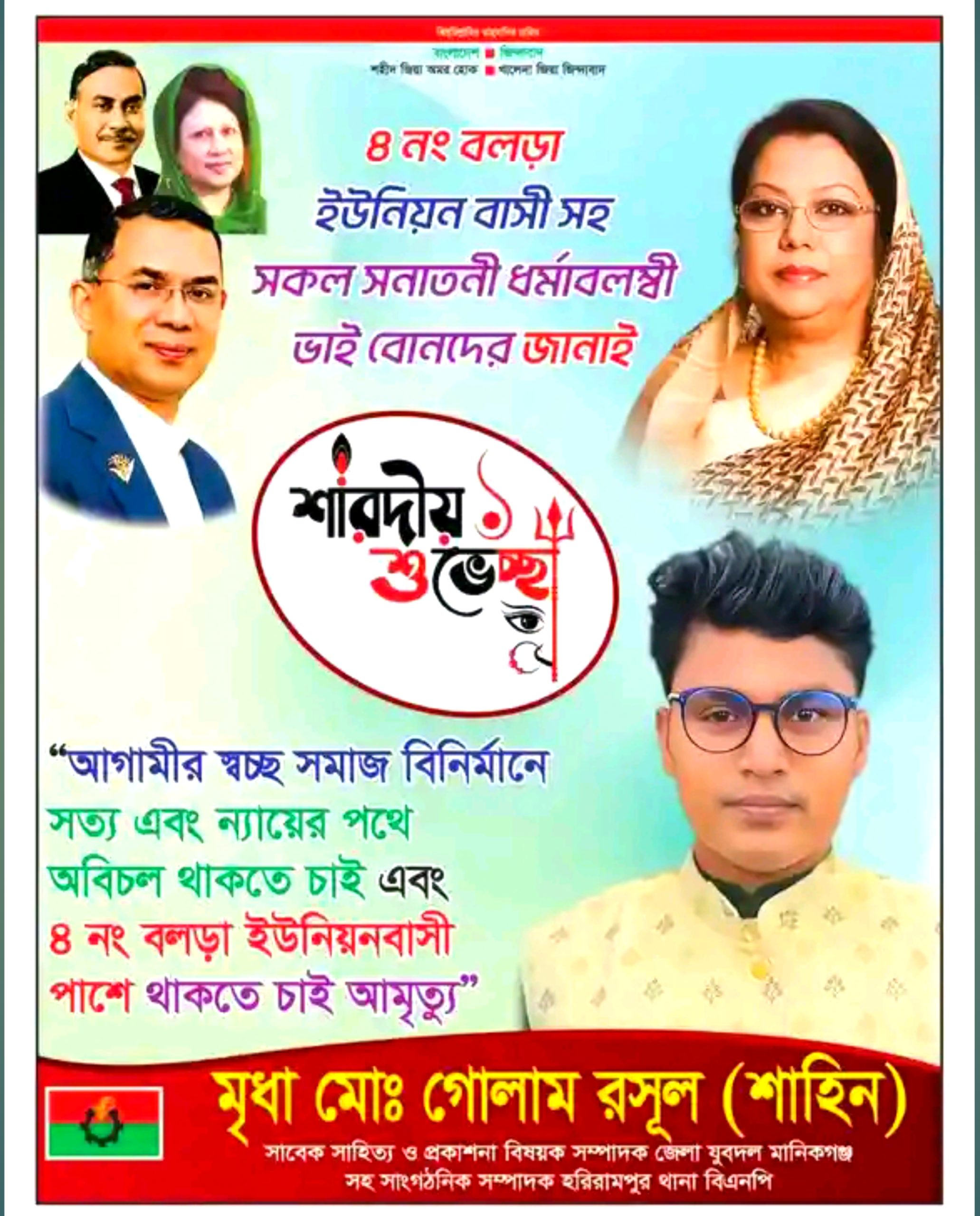 মানিকগঞ্জ জেলার হরিরামপুর উপজেলার সনাতনী ধর্মাবলম্বীদের উদ্দেশ্যে শারদীয় শুভেচ্ছা জানিয়েছেন বিএনপির উপদেষ্টামন্ডলীর সদস্য ও জেলা বিএনপির আহ্বায়ক, মা-মাটি-গণমানুষের নেত্রী আফরোজা