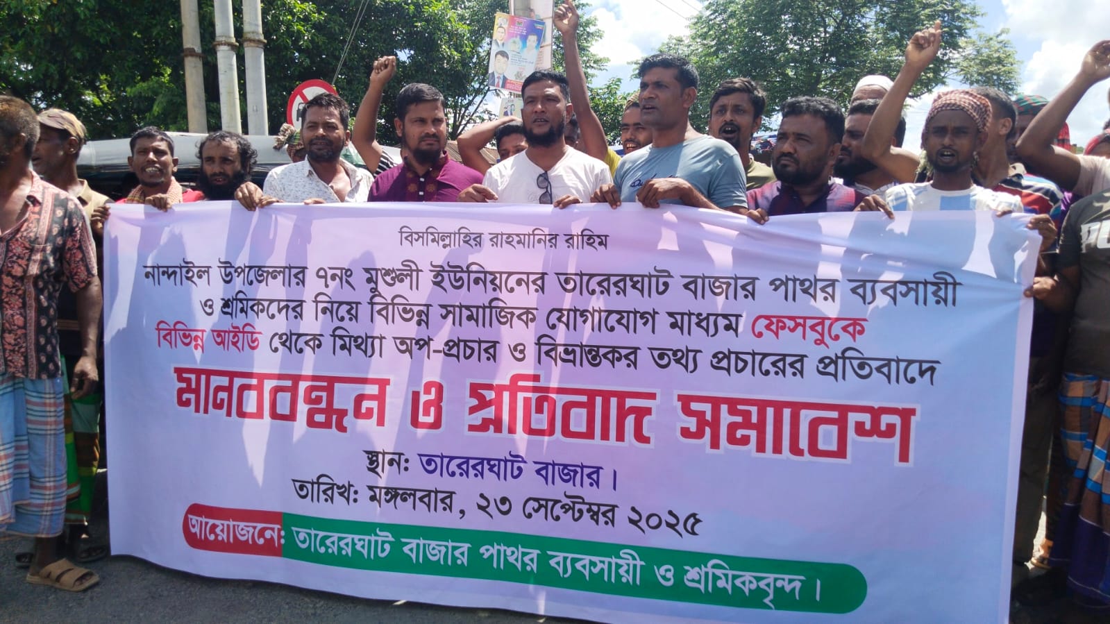 ময়মনসিংহের নান্দাইল উপজেলার ৭নং মুশুলী ইউনিয়নের তারেরঘাট বাজারের পাথর ব্যবসায়ী ও শ্রমিকদের নিয়ে মিথ্যা অপ-প্রচার ও বিভ্রান্তিকর তথ্য প্রচারে মানববন্ধন